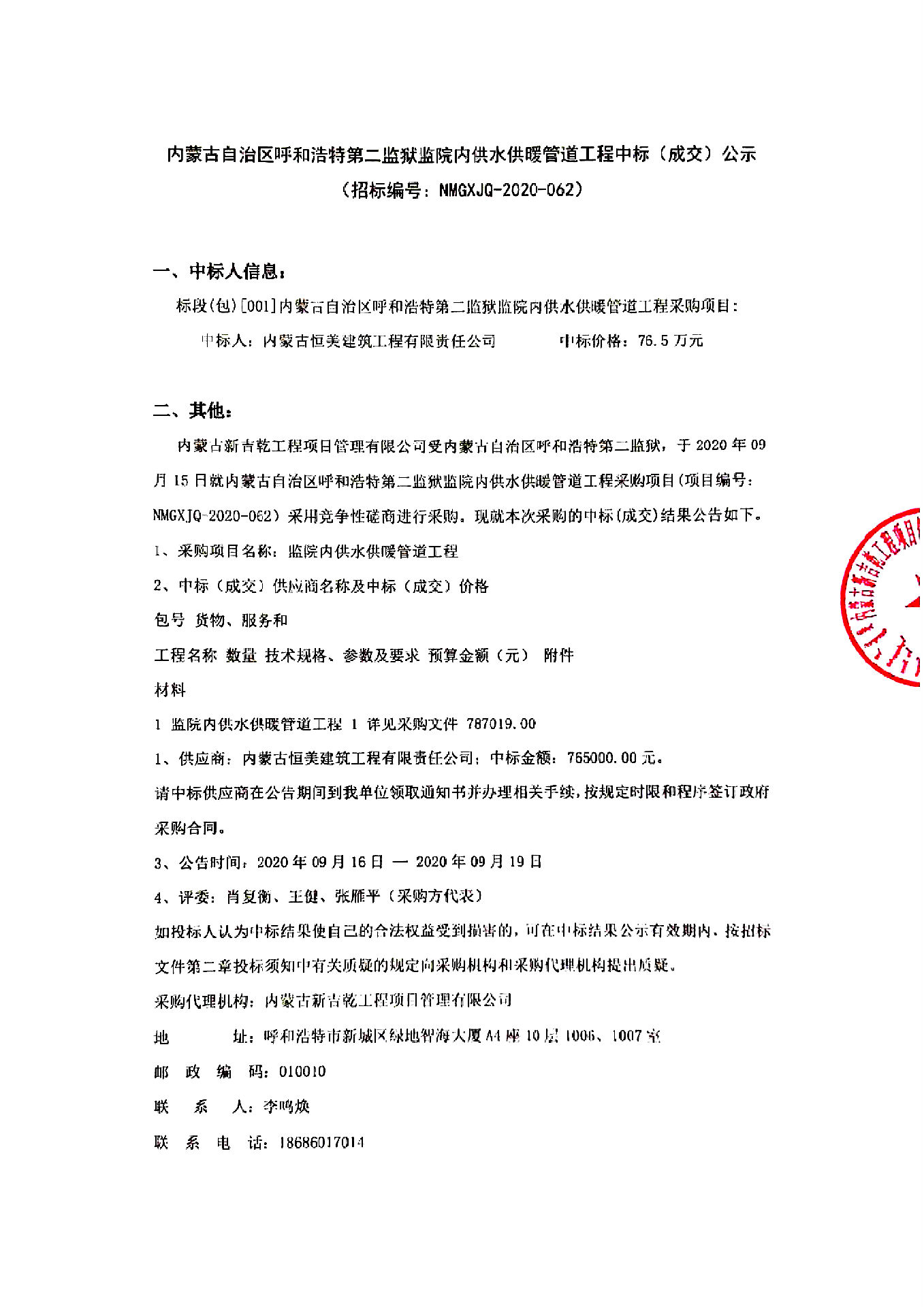 中恒華美集團中標快訊-內(nèi)蒙古自治區(qū)呼和浩特第二監(jiān)獄院內(nèi)供水供暖管道工程中標(成交)公示